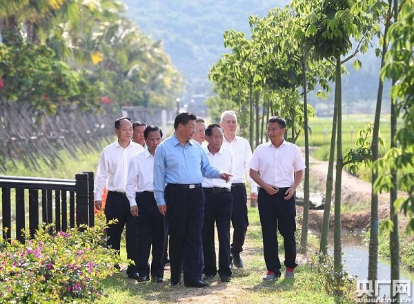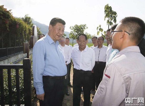 4月12日,三亞烈日炎炎,國家南繁科研育種基地水稻長勢喜人,習近平總書記在袁隆平院士等農(nóng)業(yè)技術專家的陪同下來到這里,察看水稻長勢,了解雜交水稻的產(chǎn)量、口感和推廣情況。
