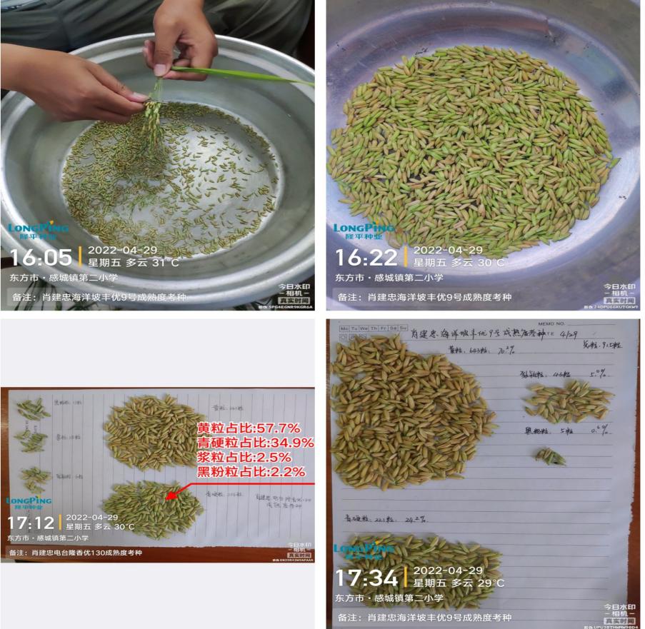 根據噴施九二O時間及田間情況,取具有代表性的3蔸田塊進行脫粒考成熟度,結合天氣情況,待到7-8成熟收割。
