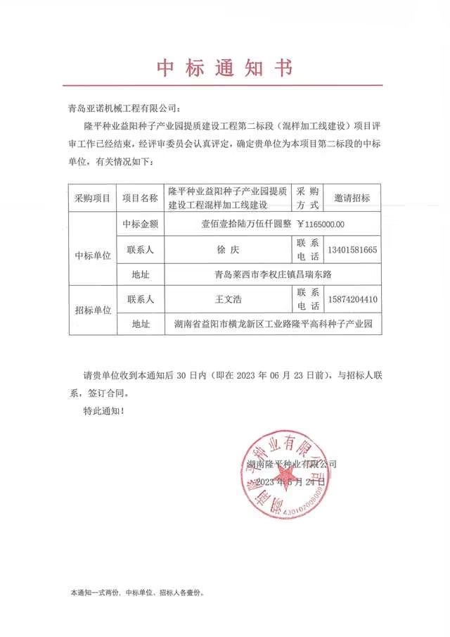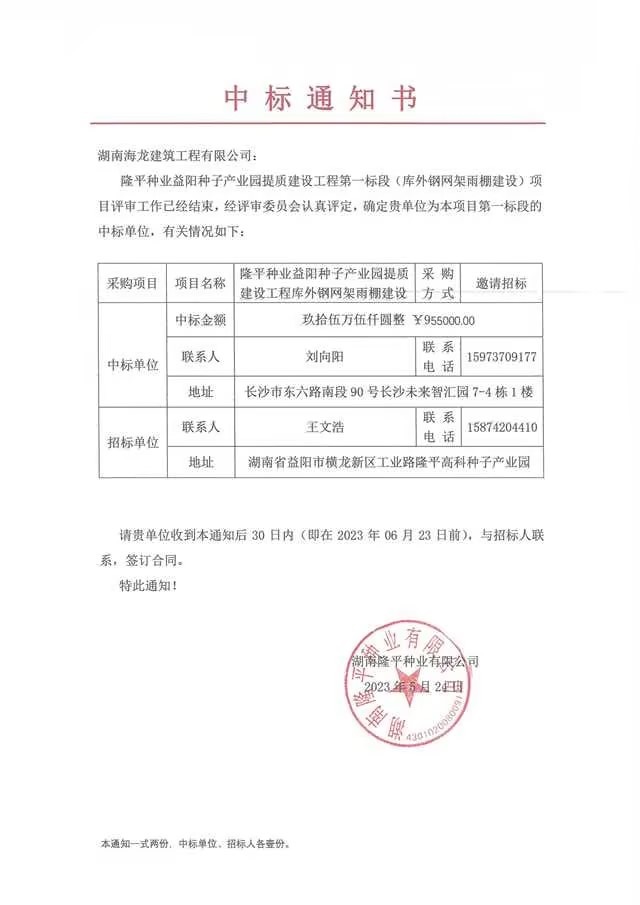 隆平種業益陽種子產業園提質建設工程項目招標評審會2023年5月19日10:00時于益陽種子產業園召開,經評審,現將中標相關信息予以公示。
