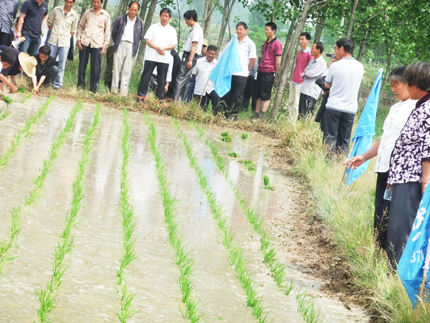 田間現(xiàn)場,公司組織專人進行了兩優(yōu)1128寬窄行栽培現(xiàn)場示范,給零售商和農(nóng)戶講解了兩優(yōu)1128寬窄行栽培技術、施肥方案及病蟲害防治等技術。