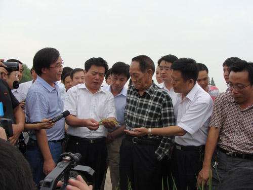 8月28日,國(guó)家雜交水稻工程技術(shù)研究中心(以下簡(jiǎn)稱(chēng)雜優(yōu)中心)信陽(yáng)分中心成立并正式授牌。為此,袁隆平院士率羅孝和、馬國(guó)輝、鄧啟云、鄧小林等專(zhuān)家提前兩天趕到信陽(yáng),觀摩兩優(yōu)1128等由雜優(yōu)中心選育的強(qiáng)勢(shì)雜交水稻新品種的百畝田間示范表現(xiàn)。