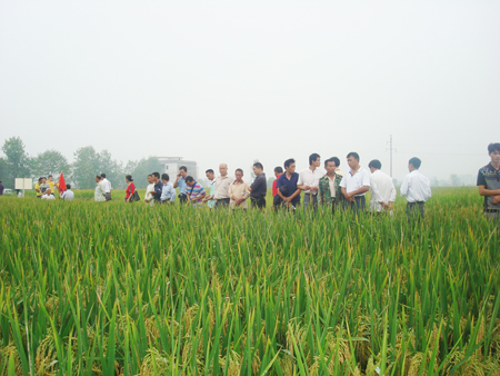 與會人員一行先乘車來到頭堂鄉七里村觀摩兩優1128、準兩優608、Y兩優19等品種,七里村是武岡市文華植保專業合作社“三統一”(統一品種、統一肥料、統一病蟲害防治)示范區,該村共種植兩優1128達200多畝,集中連片的有100多畝,都是用高肥水平管理,表現十分突出,大穗粒數達700粒左右,預計平均畝產在800公斤,高產田塊達到900公斤;準兩優608落色好,穗大粒多,籽粒大,結實率高;Y兩優19分蘗力強,有效穗多,葉青籽黃,穗大料多,主穗粒達400多粒。村民代表鄧星榮興致勃勃的介紹品種的驚人表現,與會代表熱情高漲,對巨穗稻兩優1128表示了極度關注,紛紛拔下稻穗數粒數,同時對中熟期的準兩優608、Y兩優19也贊嘆不已。