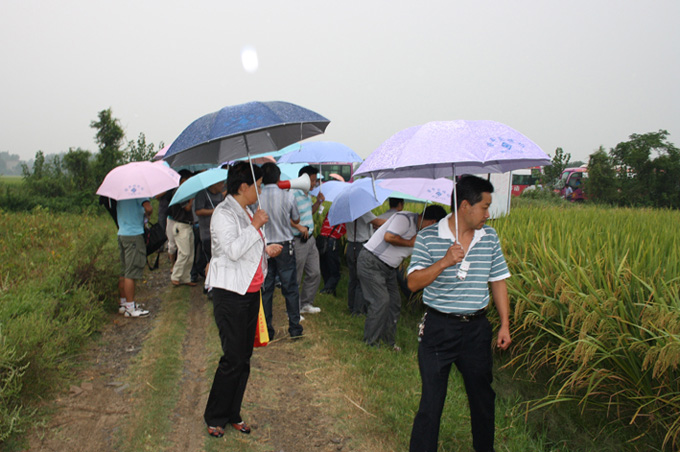 6日上午,雖然下起了大雨,也不能阻擋經(jīng)銷商現(xiàn)場觀摩的熱情。在新品種觀摩現(xiàn)場,在眾多對照中,公司潛力品種LP-14(代號)和LP-11(代號)有如鶴立雞群,表現(xiàn)出超群的豐產(chǎn)性。天門盧市鎮(zhèn)陳臺村兩優(yōu)1128的500畝連片現(xiàn)場,迎得了與會代表的一致認(rèn)可,都預(yù)計該示范片最高畝量可突破900公斤。連續(xù)種植了三年的農(nóng)戶張立成喜悅之情溢于言表,表示種植1128以來,年年獲得豐收,年年創(chuàng)新高。Y兩優(yōu)1號千畝示范片區(qū),在天門細(xì)條病和稻曲病暴發(fā)的今年,展現(xiàn)了其獨(dú)特的抗性。