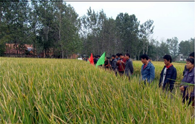 10月3日,在這普天同慶的日子里,隆平種業與定遠縣興農種業,共同組織定遠縣零售商和各鄉鎮種植大戶150多人,召開了“湖南隆平水稻觀摩會及巨穗型超級稻兩優1128現場觀摩預訂會”。會議分為室外觀摩和室內交流兩大流程。首先對定遠縣爐橋鎮青洛鄉的兩優1128等隆平示范田進行了參觀。