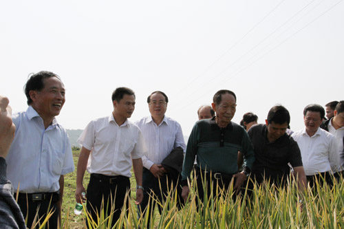 袁隆平院士深入田間,雙手扒開禾蔸,察看稻穗生長情況,不時拔下一根稻穗數一數谷粒的數量,詢問栽培種植情況,不時稱贊:“晚稻能長得這樣子,非常不簡單……老百姓常規種植,上600公斤沒有一點問題的……國家給湖南定的增產任務是42億斤,如果準608累計推廣1000萬畝,光這一個品種就能完成一半的增產任務”,一再要求陪同的廖總及其他領導一定要加強推廣力度,爭取進入“種三產四”豐產工程。