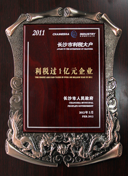 熱烈祝賀我司榮獲“二O一一年度長沙市利稅大戶——利稅過一億元的企業”光榮稱號。