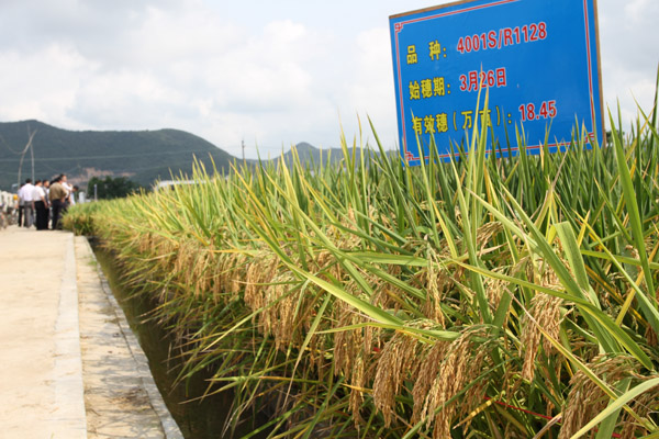在三亞市田獨鎮展示的新品種有數十個之多,均是隆平高科后續強勢新組合。據4月中旬考種測產數據顯示,廣占63-2S/HR1128和4001S/HR1128兩個品種理論產量分別達到1107.4公斤和1123.5公斤,均突破第四期超級稻1000公斤的大關。