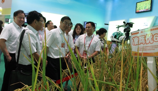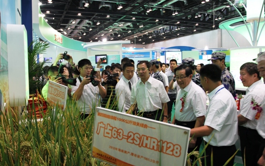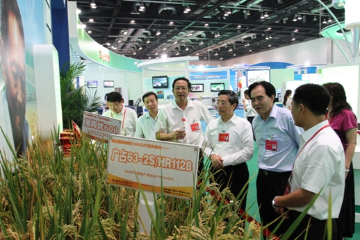 我公司展位居于現(xiàn)代農(nóng)業(yè)產(chǎn)業(yè)板塊,通過“活體水稻+宣傳片+實(shí)物(米樣和包裝種子)+宣傳單”的方式,重點(diǎn)展出了袁隆平院士第四期超級(jí)稻四個(gè)攻關(guān)品種中的63-2S/HR1128和準(zhǔn)兩優(yōu)608(晚稻),參展品種全部為我公司擁有的自主研發(fā)產(chǎn)權(quán)品種。展會(huì)期間,我司的展臺(tái)受到眾多領(lǐng)導(dǎo)關(guān)注,中共中央書記處書記、中央紀(jì)委副書記何勇,全國(guó)政協(xié)副主席、科技部部長(zhǎng)萬鋼,湖南省省委書記、省人大常委主任周強(qiáng),湖南省委常委、副省長(zhǎng)陳肇雄,廣西壯族自治區(qū)黨委書記、區(qū)人大常委會(huì)主任郭聲琨,全國(guó)政協(xié)常委、廣西壯族自治區(qū)副主席、原中國(guó)農(nóng)業(yè)大學(xué)校長(zhǎng)陳章良等領(lǐng)導(dǎo)來到我司展位,特別關(guān)注了我司的展出項(xiàng)目,饒有興趣地詢問了我司在超級(jí)稻育種、推廣等方面的相關(guān)信息,并對(duì)我司在雜交水稻育種方面取得成就給予充分的肯定。認(rèn)為我司利用高新技術(shù)手段,成功研發(fā)高科技含量、高附加值的超級(jí)稻新品種,并率先嘗試全程機(jī)械化制種等手段引領(lǐng)產(chǎn)業(yè)升級(jí),實(shí)現(xiàn)雜交水稻制種的規(guī)模化和產(chǎn)業(yè)化,為維護(hù)我國(guó)糧食安全做出了重大的貢獻(xiàn)。
