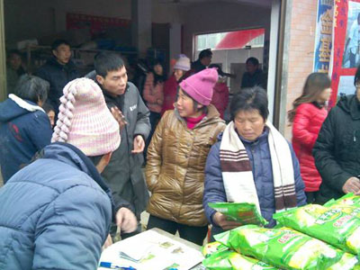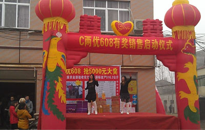1月28日,在峪山鎮吳河村經銷商肖其亮處舉辦了襄陽大型的C兩優608有獎促銷專場活動,同時代理商杭偉出資兩千元請來戲班,為當地老百姓帶來豐富多彩的文藝節目。每購買一袋C兩優608水稻種子均有機會贏取5000元現金大獎,獎項頗豐,從2元、10元、50元直至5000元不等,中獎率高達87.67%。除此之外,老百姓在活動當天購種達到一定數量還能獲得工作服、開水煲、電熱毯、油等豐厚禮品。該活動吸引了眾多的老百姓,場面異常火爆,當天銷售C兩優608種子一千多斤,超過去年該零售商C兩優608的總銷量,零售商肖其亮信心倍增。當場開出好幾個100元、50元現金獎勵,10元、2元的獎勵更是不計其數,襄陽電視臺兩名記者對此次活動進行了詳細的跟蹤采訪。