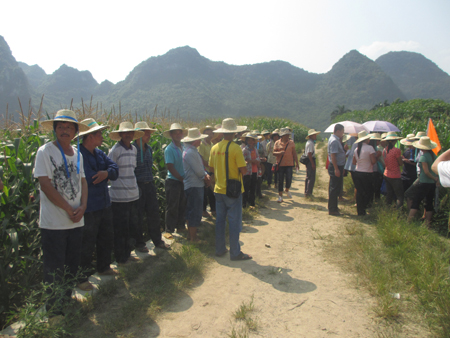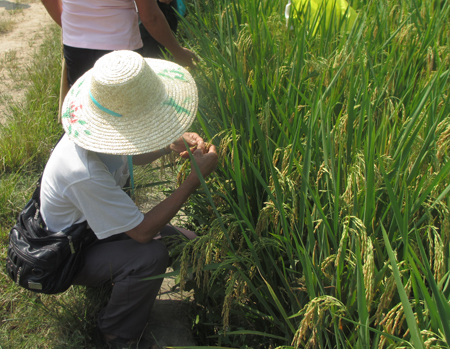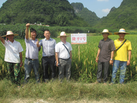秋高氣爽,沉甸甸的稻穗迎風擺動。廣西崇左市天等縣于9月18日上午在龍茗鎮那乙屯召開了隆平1號示范觀摩會。來自天等縣各鄉鎮的零售商、種田大戶及那乙屯農戶86人前來觀摩。示范田邊,有的忙著數穗粒數,有的忙著照相,有的忙著探討栽培技術,個個贊不絕口。
