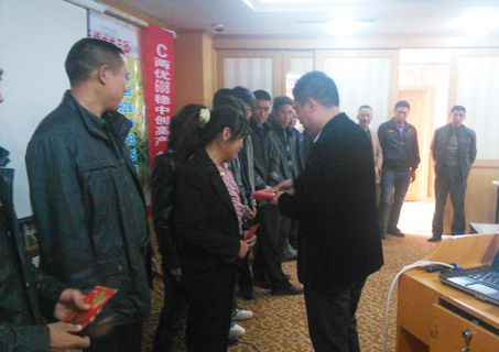 2013年10月23日,襄陽(yáng)C兩優(yōu)608高產(chǎn)擂臺(tái)賽頒獎(jiǎng)大會(huì)在襄陽(yáng)麗源大酒店隆重舉行。與會(huì)的有百十位獲獎(jiǎng)農(nóng)戶以及數(shù)十位C608零售商。會(huì)上,盧成林經(jīng)理向大家介紹了隆平種業(yè)今后的發(fā)展、公司后續(xù)品種,重點(diǎn)介紹了C兩優(yōu)608及后續(xù)品種的營(yíng)銷政策。交流過(guò)后,大家對(duì)C兩優(yōu)608信心滿滿。