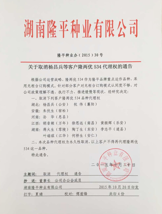 關于取消楊昌兵等客戶隆兩優(yōu)534代理權的通告