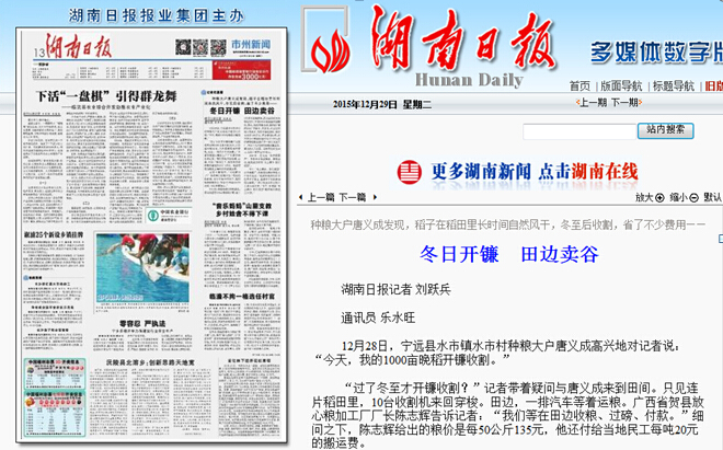 12月28日,寧遠(yuǎn)縣水市鎮(zhèn)水市村種糧大戶唐義成高興地對(duì)記者說:“今天,我的1000畝晚稻開鐮收割。”