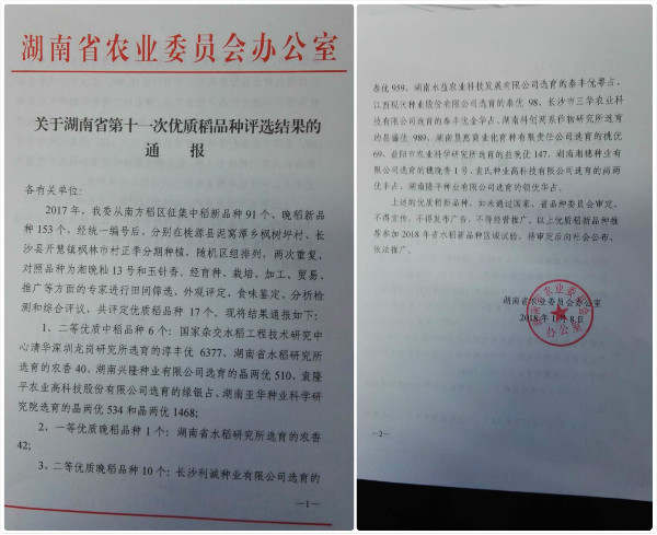 2018年1月8日,湖南省農(nóng)業(yè)委員會(huì)公布了湖南省第十一次優(yōu)質(zhì)稻品種評(píng)選結(jié)果,我公司推廣品種晶兩優(yōu)534、晶兩優(yōu)510均入選二等優(yōu)質(zhì)中稻品種(無(wú)一等優(yōu)質(zhì)中稻品種),領(lǐng)優(yōu)華占入選二等優(yōu)質(zhì)晚稻品種。