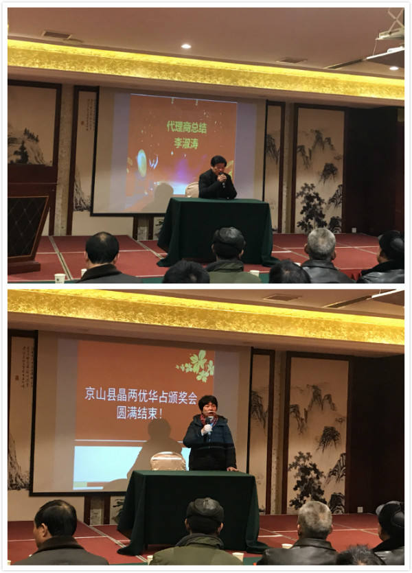 2018年1月20日,京山縣“晶兩優華占”高產擂臺賽頒獎大會在豪威凱瑞大酒店召開,讓晶兩優華占火了起來,也讓這個冬天火熱起來了。 會議首先由區域人員對晶兩優華占的突出優勢和米質特點進行了講解,讓零售商和農戶深入了解了晶兩優華占的優勢,鐘祥、隨州米產對晶兩優華占定點收購、優先收購、加價收購的 事實更是大大增強了農戶的信心。 接著,零售商代表陳總分享了他與晶兩優華占的故事,陳總介紹到,2017年他參加了大大小小十多場晶兩優華占測產會,親眼見證了一個又一個高產數據的誕生,這讓他對晶兩優華占更加放心,更加認可了。 本次會議現場公布了京山縣晶兩優華占2017年度高產擂臺賽的獲獎名單,并為獲獎農戶頒發了豐厚的獎品。 分享交流環節,兩位獲獎農戶代表分別就自己種植晶兩優華占的經驗進行了分享,讓大家對晶兩優華占高產量、易管理的優勢有了更加清晰的了解。 代理商李總則分享了自己對農業現狀和前景的見解,如今的市場對米質的要求越來越高,因此,選擇米質好的品種,不僅零售商好賣,而且農戶種的放心,而晶兩優華占就是零售商和農戶的上好選擇。 在這辭舊迎新的時刻,京山縣晶兩優華占高產擂臺賽頒獎大會圓滿結束,通過此次會議我們堅定了信心,統一了思想,相信未來晶兩優華占必能不負其造福之名,為更多農戶送去豐收的希望。